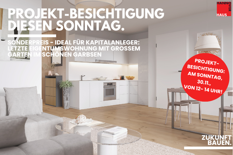 Am Sonntag, den 30.11., laden wir Sie herzlich zu unserer Projekt-Besichtigung unserer letzten verfügbaren Eigentumswohnung im Projekt „Wohnhöfe Im Stühe“ im schönen Garbsen Ortsteil Horst ein. Vor Ort zeigen wir Ihnen unsere bereits fast fertiggestellte Eigentumswohnung. Wir freuen uns auf Sie!