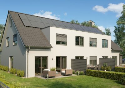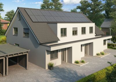 Auf dem Grundstück entstehen drei individuell geplante Reihenhäuser, die speziell auf die Anforderungen der Wohnungsgenossenschaft sowie der zukünftigen Mieter zugeschnitten sind. Das Projekt vereint zeitgemäße Architektur mit einem klaren Fokus auf energieeffizientes Bauen und hohe Wohnqualität.