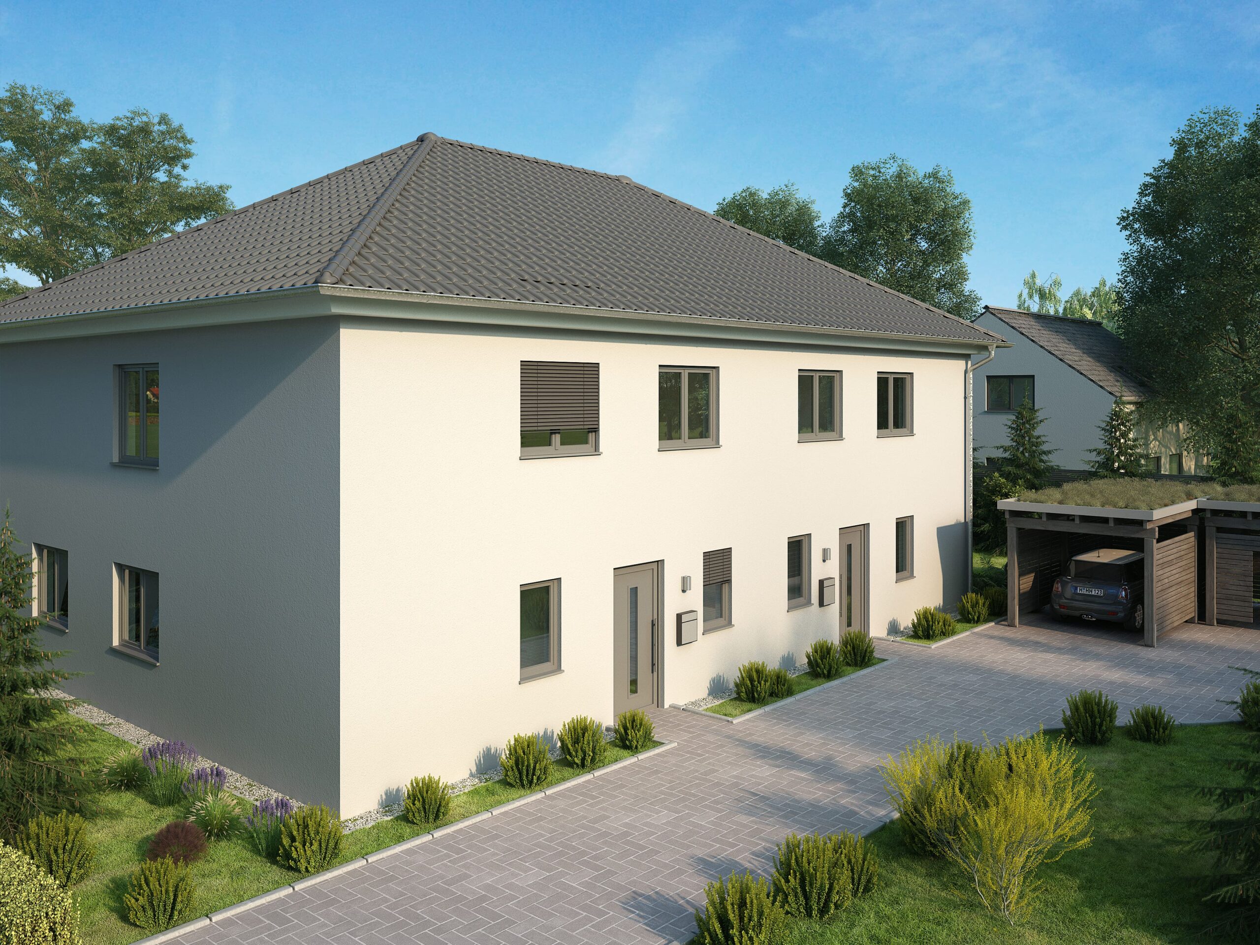 - Moderne Putz-Fassade: Die Fassade aus Putz verleiht dem Doppelhaus eine zeitlose sowie moderne Eleganz und passt perfekt in die Nachbarschaft.